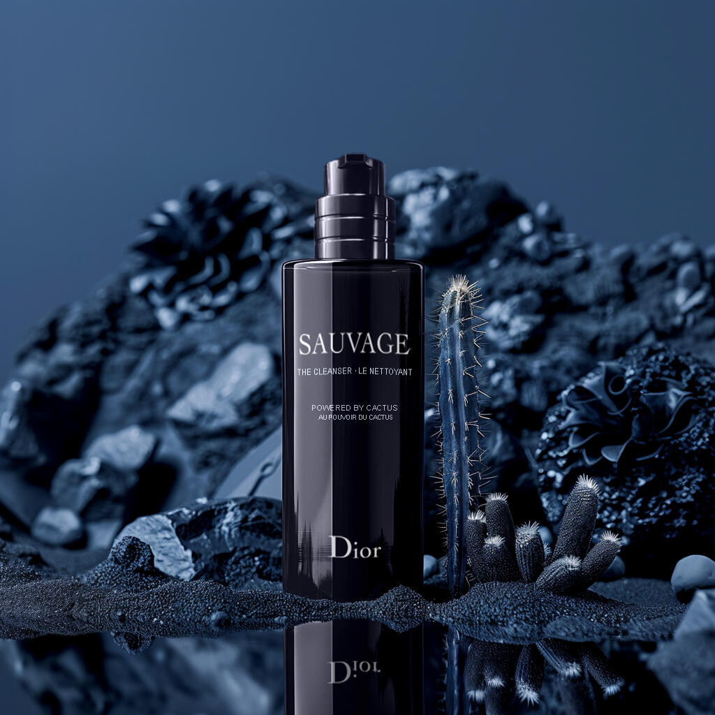 While capturing the Dior Sauvage men's face cleanser we captured the mysterious allure of the dark blue theme, reflecting the rugged luxury of Dior and natural cactus essence of the product.