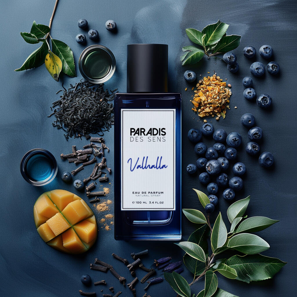 Designed with precision to match its blue theme, the arrangement highlights the perfume's notes while maintaining a sleek, minimalist brand aesthetic.