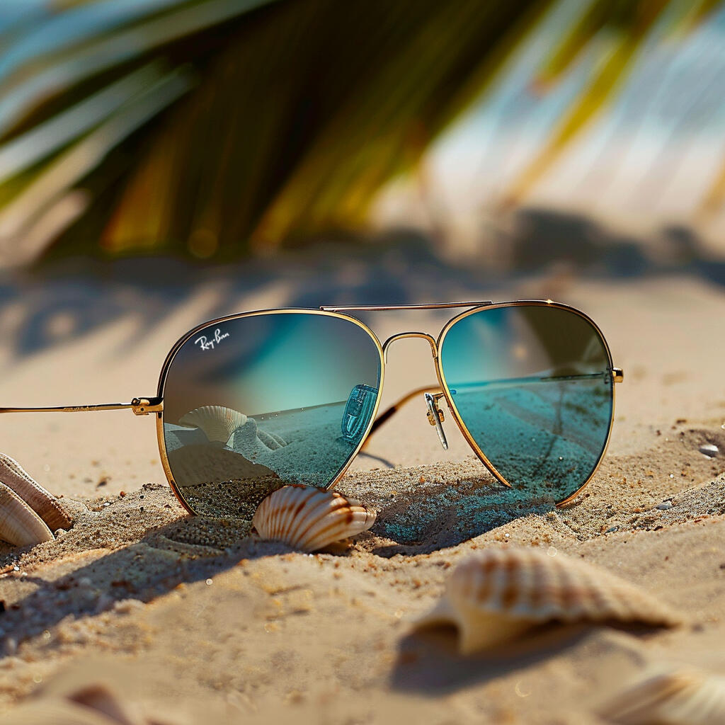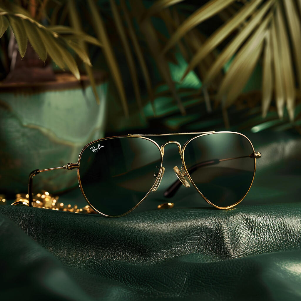 We emphasized the refined elegance of the Ray-Ban aviator design, highlighting its golden shine and sophisticated structure to evoke a sense of timeless luxury.